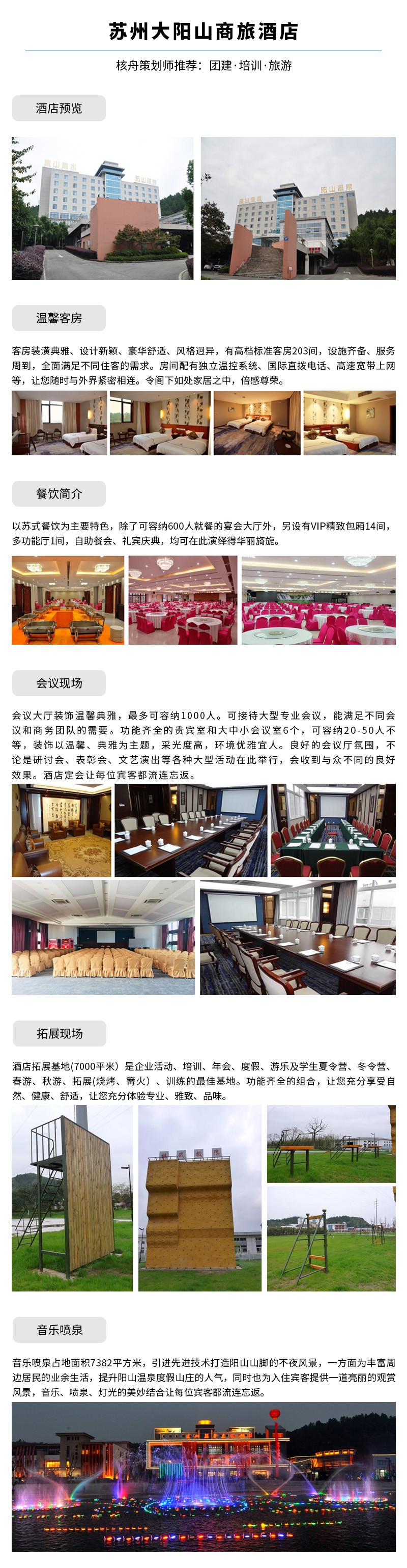 核舟蘇州拓展基地-蘇州大陽山商旅酒店于2010年1月對外營業,酒店已于2017年10月重新裝修,是蘇州高新區滸墅關經濟開發區下屬的一家涉外酒店,按照四星級標準建造。酒店依山而建,著名的樹山風景區位于酒店山腳下,酒店毗鄰大陽山風景區, 自然環境絕佳。總建筑面積38000平方米,有純天然地質溫泉、網球館、體育中心、拓展基地、會議室、棋牌室及各類高檔客房。蘇州大陽山商旅酒店是旅游、度假、會議的理想下榻之所。