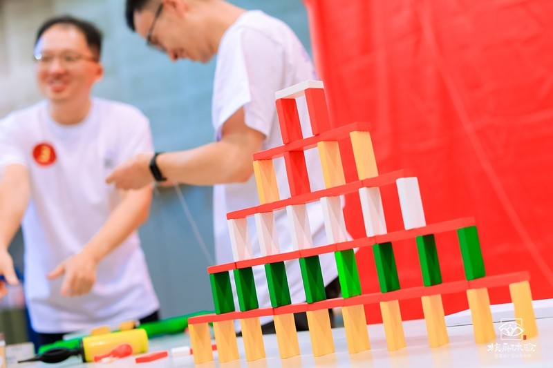 看著一點一點搭建起來的裝置和多米諾,展現了同宜醫藥小伙伴們的創意及精益求精的態度。萬丈高樓平地起,要搭建如此精密的機關,靠得是集體的智慧與配合,在這里,團隊凝聚力得到了最好的體現。