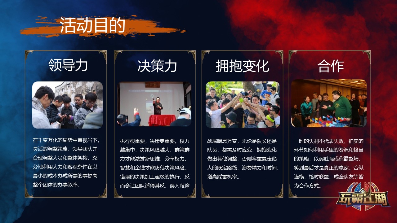 玩霸江湖是目前國內首款數字團建操作系統,基于玩霸平臺可以開發一系列企業定制化的主題團建體驗產品。為企業實現多元化團隊建設構建了一個可持續設計體驗是數字團建技術平臺。