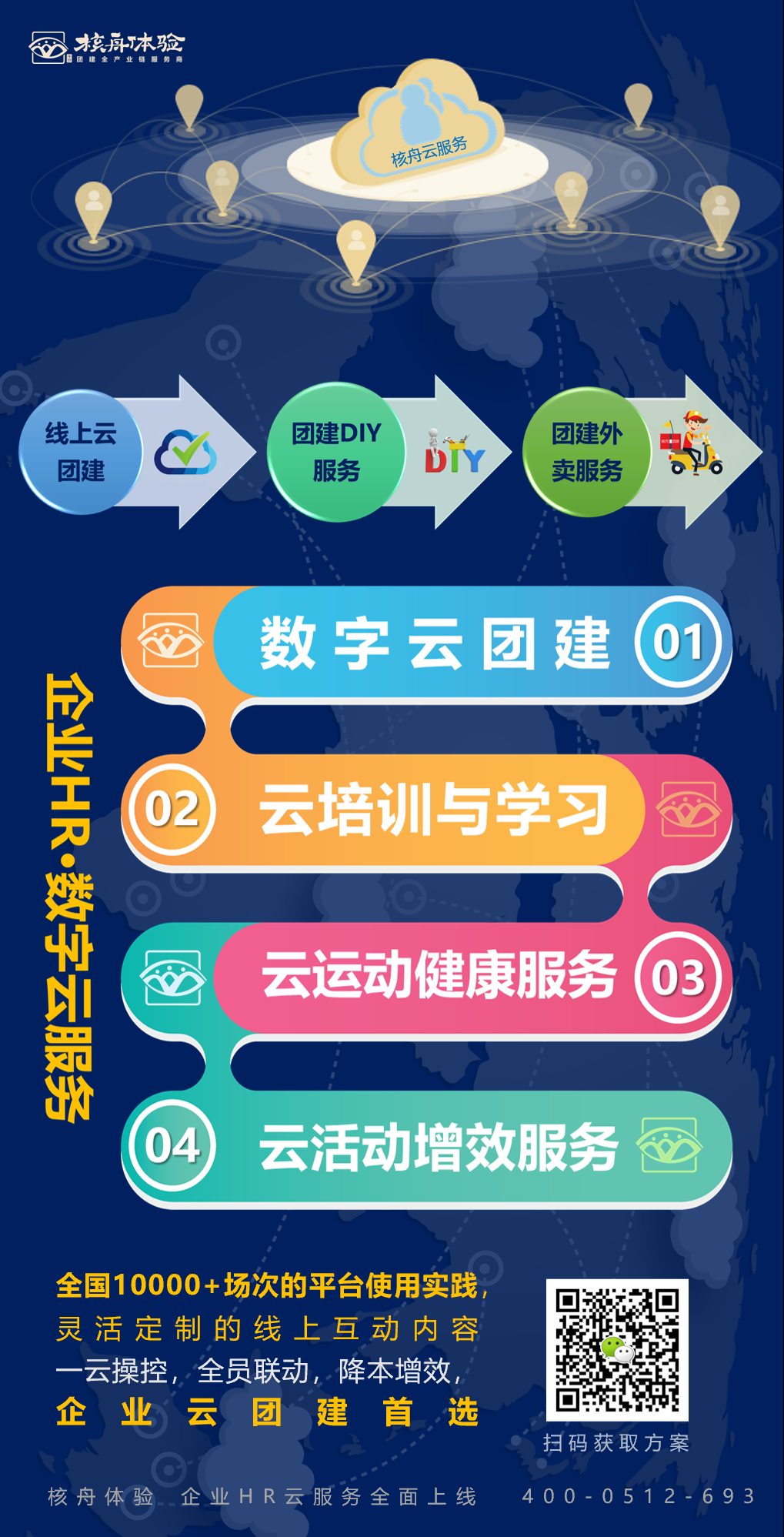 企業HR·數字云服務包括四大版塊:數字云團建、云培訓與學習、云運動與健康服務、云活動增效服務。