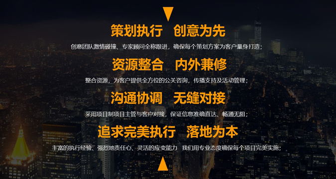資源整合,內(nèi)外兼修:整合資源,為客戶提供全方位的公關(guān)咨詢,傳播支持及活動(dòng)管理;